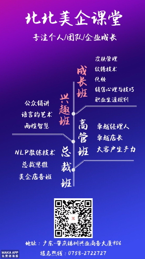 2016年9月成立肇慶分公司,連接廣佛、輻射粵西。北北美業(yè)獨(dú)家首創(chuàng)美業(yè)五行系統(tǒng),從文化、團(tuán)隊(duì)、品項(xiàng)、營(yíng)銷、顧客五大板塊介入教育、參與店務(wù)建議。迄今為止已服務(wù)百余間美容企業(yè)、培養(yǎng)了數(shù)以千計(jì)的優(yōu)秀美業(yè)人才。