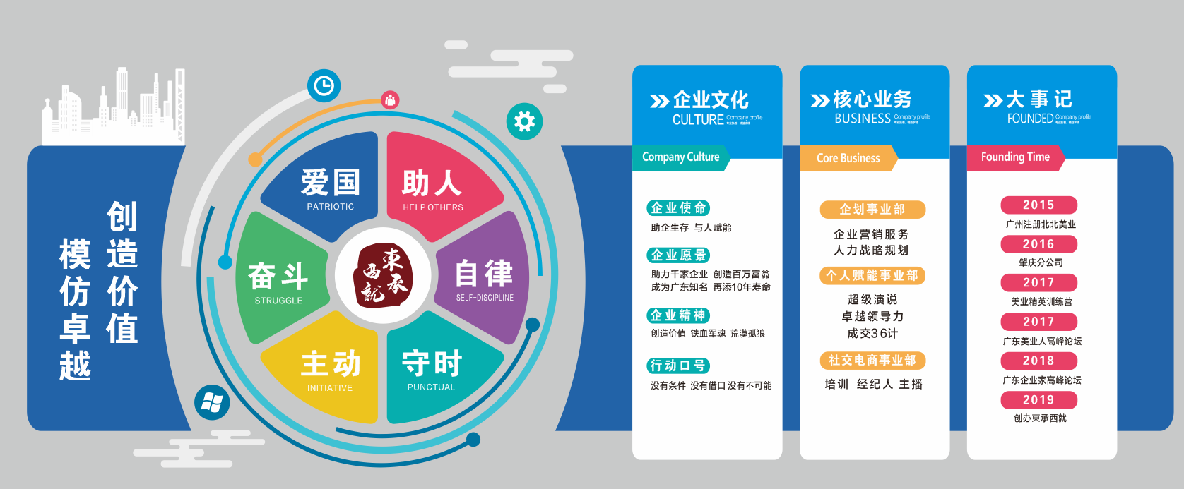 東承西就(廣東)教育信息咨詢服務(wù)有限公司,創(chuàng)辦于2019年8月,由北北美業(yè)(廣州北北商貿(mào)有限公司,于2015年9月在廣州市天河區(qū)注冊(cè))原班人馬從新出發(fā),以企業(yè)服務(wù)和個(gè)人賦能為核心業(yè)務(wù)。2020年簽約抖音MCN機(jī)構(gòu),布局社交電商。