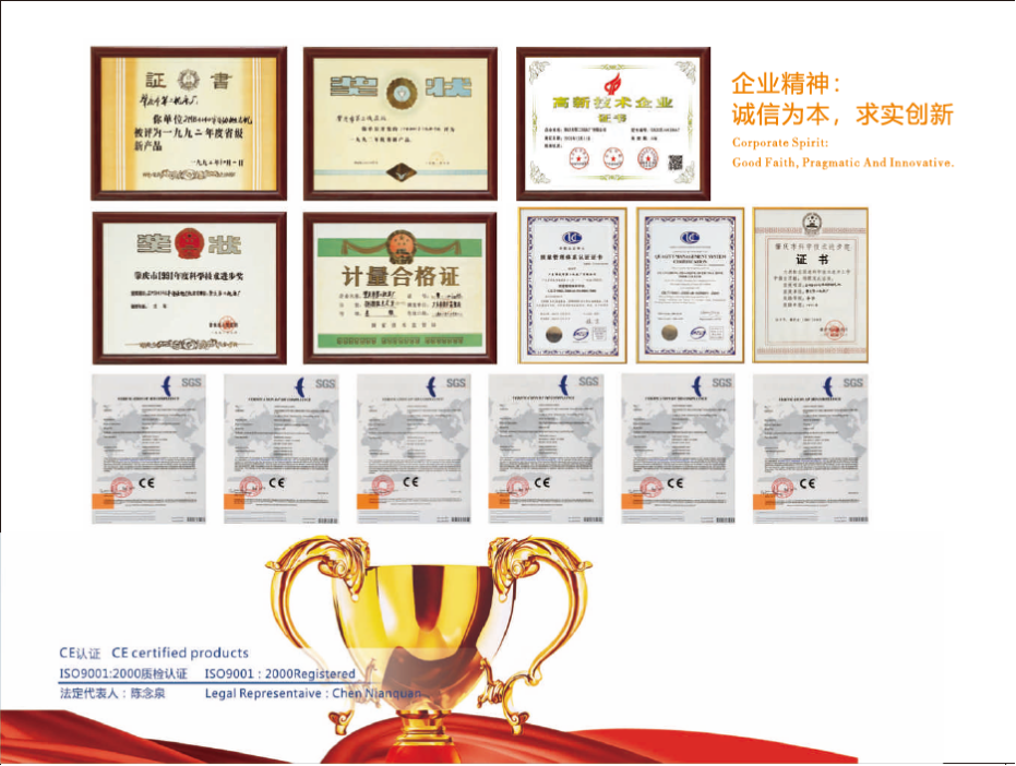 公司十分注重人才和科研。現(xiàn)有員工230多人,其中,技術研發(fā)人員占了39人,廠房總占地面積達五萬多平方米,擁有160多臺進口的和國產(chǎn)的先進生產(chǎn)加工設備、檢測設備,包括:德國大型導軌磨床、英國滾齒機床、意大利花鍵滾齒機床、法國銑床、大型坐標式鏜床、立式加工中心、萬能工具顯微鏡、大型工具顯微鏡等。公司引進了先進的國際企業(yè)管理理念和多元化的管理模式,擁有自主進出口權,是一家集產(chǎn)品創(chuàng)新,開發(fā)、生產(chǎn),銷售于一體的高新技術企業(yè)。公司產(chǎn)品一直引領業(yè)內(nèi)創(chuàng)新潮流,并長期保持著健康、穩(wěn)定、快速的增長。公司拋光機械設備占國內(nèi)市場同類產(chǎn)品70%以上的份額,國外市場占公司總銷售額的30%。公司憑借五十多年的機械研制經(jīng)驗和精湛工藝,以及三十多年在器皿加工及拋光方面的經(jīng)驗,先后獲得多個產(chǎn)品獎項:2MB4140半自動拋光機在一九九二年榮獲肇慶市科技進步獎及廣東省優(yōu)秀新產(chǎn)品獎。多個產(chǎn)品獲得了國家發(fā)明專利權及擁有CE認證。公司已通過了ISO9001:2000質(zhì)量體系認證。