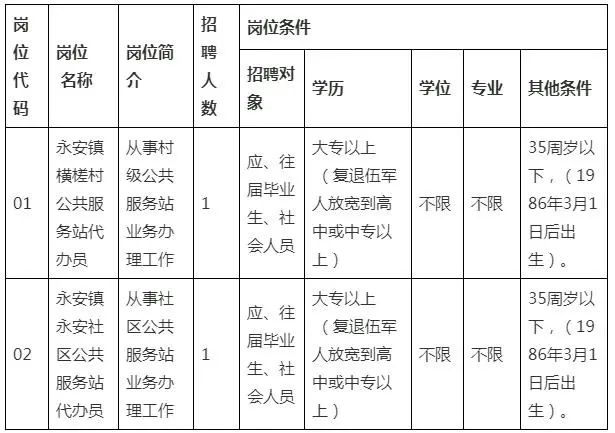 本次公開招聘村(社區(qū))公共服務(wù)站業(yè)務(wù)代辦員2名,每人只能報考一個崗位。