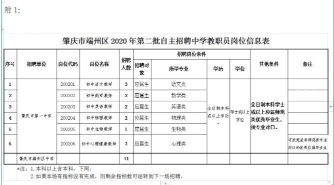 本次自主招聘中學(xué)教職員指標(biāo)共12個(gè),崗位分別是初中語(yǔ)文、初中數(shù)學(xué)、初中英語(yǔ)、初中物理、初中生物、初中心理,具體見(jiàn)附件1。